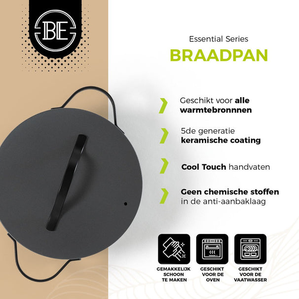 BE Living sauté pan with Lid - Ø 28cm - Ceramic non-stick coating - PFAS free - Suitable for all heat sources - Black