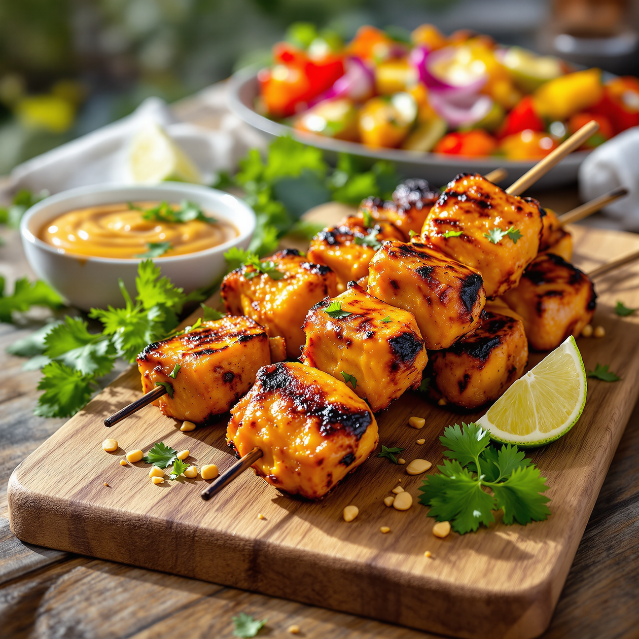 Healthy food goes great from the BBQ. Especially with these skewers that you make entirely yourself with pure ingredients, even the peanut sauce.