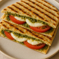 Flatbread toast with pesto, tomato & mozzarella