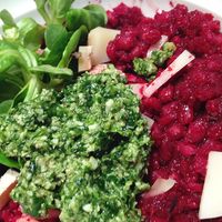 8. When the risotto is almost ready, stir in the beet puree and the pieces of beet. Once the beets are heated, stir in the butter. Season to taste with salt and pepper. Serve the risotto with the pesto and corn salad leaves