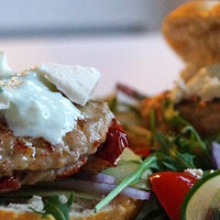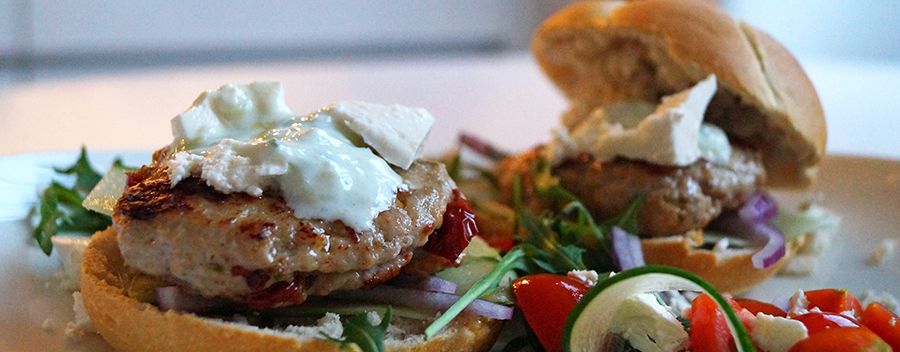 Cut open the sandwiches and spread with yogurt sauce. Place a few slices of cucumber on top and some cherry tomatoes, if desired. Now place the chicken burger on top, garnish with feta cheese and arugula. Divide the rest of the arugula and cucumber over the plate.