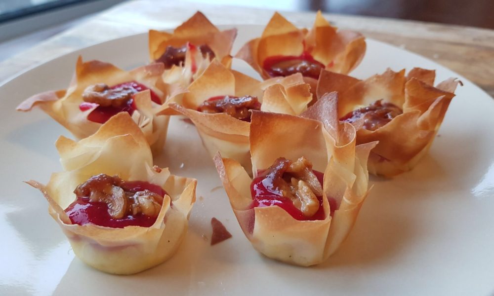 Knapperig brie-hapje met frambozensaus en gekarameliseerde walnoot