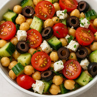 Een zomerse salade met kikkererwten, feta en verse kruiden.