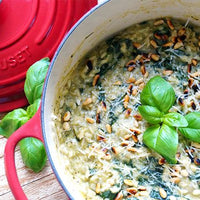 Risotto with spinach and pesto is a creamy, filling dish that is perfect as a main or intermediate dish. The risotto rice is slowly cooked in broth, white wine and vegetable cream, while spinach and pesto provide extra flavor. The whole thing is garnished with toasted pine nuts, pecorino cheese and fresh basil for a rich and festive meal.
