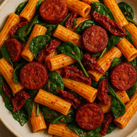 Pikante chorizo pasta met spinazie en zongedroogde tomaten