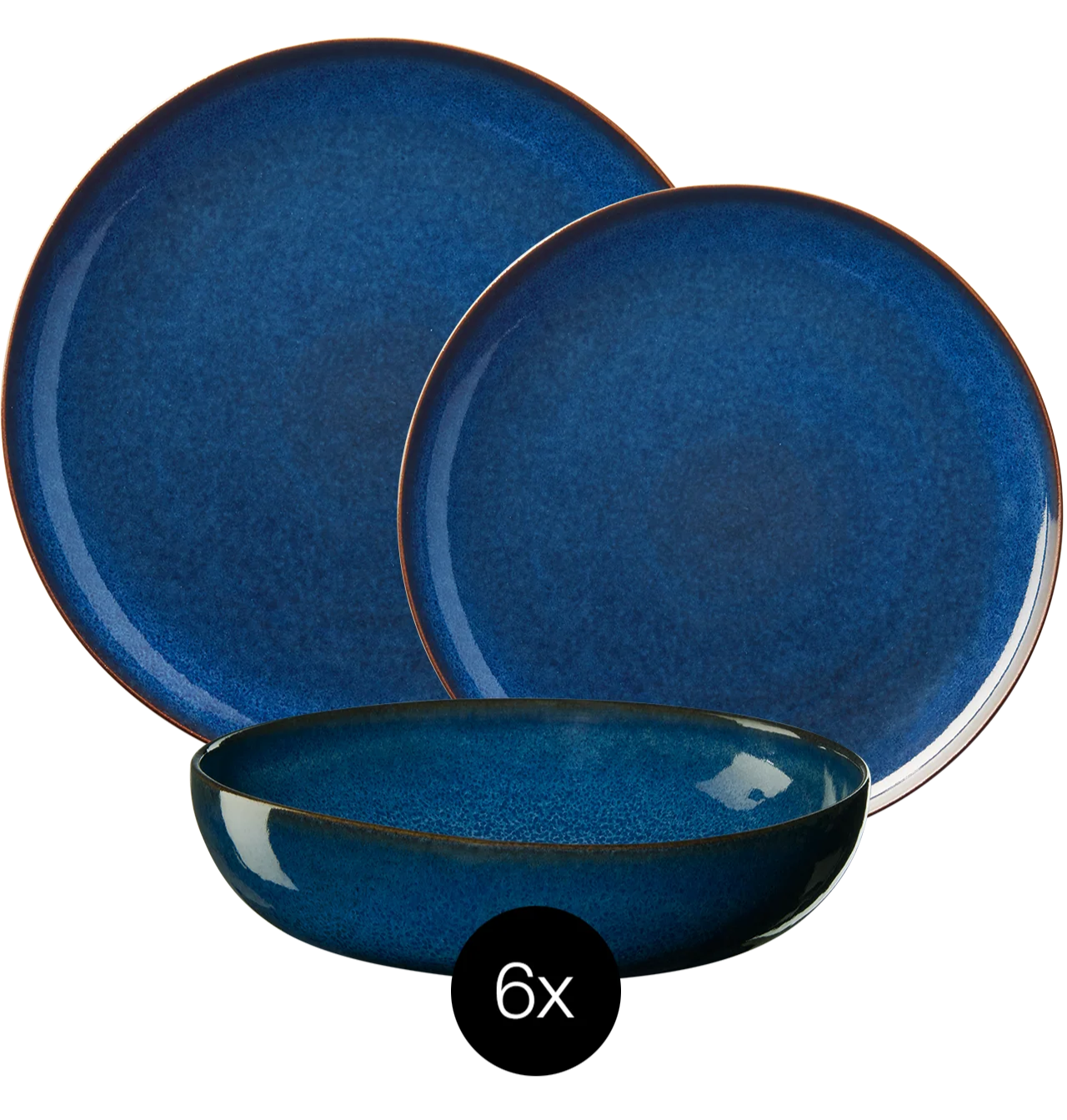 With this stylish tableware set from ASA Selection, you can effortlessly create a complete table setting for six people. The set consists of sturdy stoneware with a deep midnight blue reactive glaze that gives a luxurious, handcrafted appearance. Perfect for hot and cold dishes, from soup to main course and dessert. Thanks to the timeless design, the plates and bowls fit both modern and classic interiors. This 18-piece set is ideal for everyday use and festive occasions.