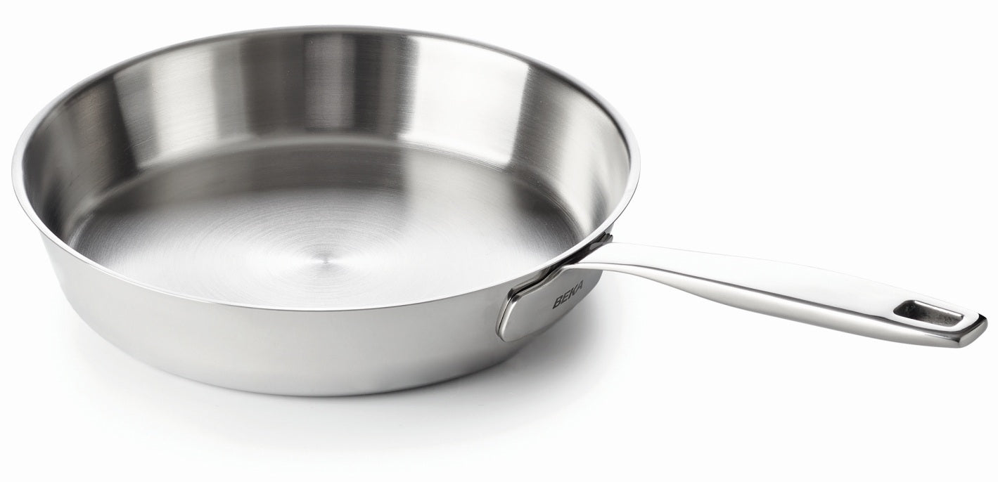 Discover the spacious Beka Maestro frying pan ø 28 cm, ideal for larger dishes such as paella, stir-fries, or multiple servings at once. Made from high-quality Inox 18/10 stainless steel without a non-stick coating, ensuring pure flavors and a solid impression. Thanks to the thick base, it distributes heat evenly and is suitable for all heat sources, including induction. With its professional finish, generous size, and 25-year warranty, this is a pan you can rely on for years to come.