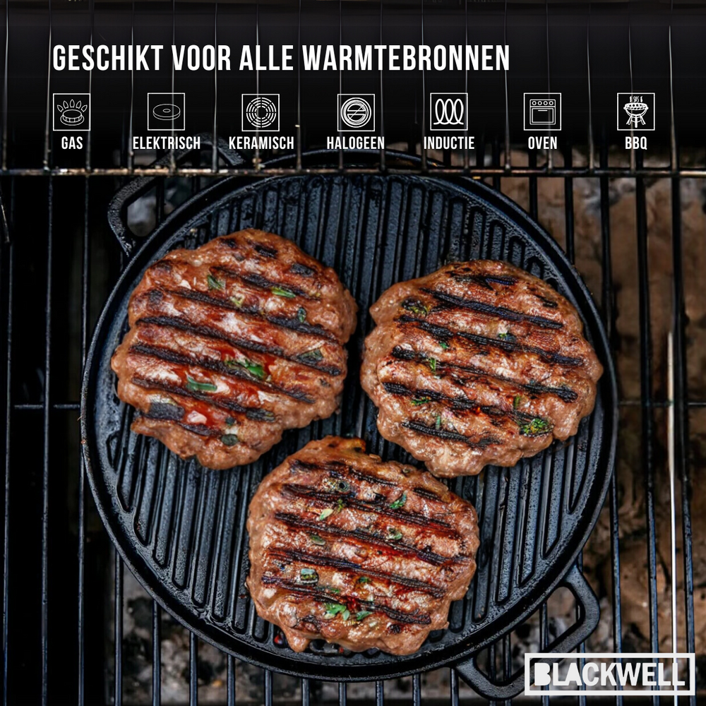 Discover the ultimate versatility in your kitchen and on the BBQ with the Blackwell cast iron cookware set, consisting of frying pans of Ø 16 cm, Ø 20 cm, and Ø 25 cm, and a grill plate of Ø 30 cm, all made from solid unseasoned cast iron for exceptional heat retention and distribution. By seasoning the pans before use, you develop a natural, durable non-stick coating without harmful coatings, which only improves with each use.