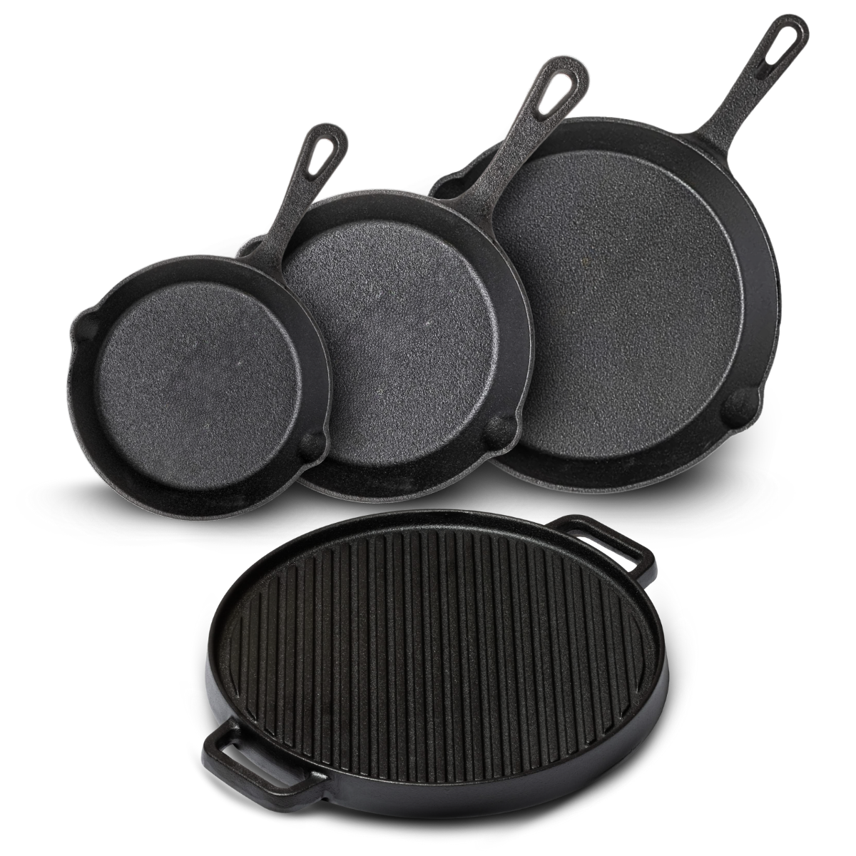 Whether you're frying delicate eggs in the smallest pan, making pancakes and vegetables in the medium pan, cooking larger pieces of meat and fish in the Ø 25 cm pan, or creating an authentic grill pattern on the spacious grill plate, this set performs on all heat sources – from gas and electric to ceramic, halogen, and induction – and can even be used directly on the BBQ, open fire, or in the oven.