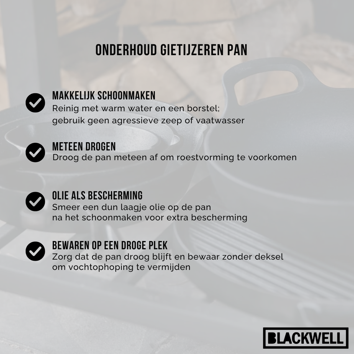 Since these Blackwell pans do not have a non-stick coating, it is important to season these Blackwell pans. Hand washing and immediate drying are recommended to maintain the quality of the cast iron and to prevent rust formation.
