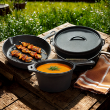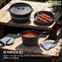 The Blackwell Dutch Oven BBQ Set Cast Iron is a complete, robust cookware set for outdoor and kitchen use. The set includes a spacious roasting pan (Dutch oven), a saucepan, and a frying pan, all made of high-quality cast iron for optimal heat distribution and retention. With the included lid lifter, you can safely remove the heavy lid from the roasting pan, ideal for barbecuing or campfires. This set provides everything needed for preparing stews, sauces, baking, and roasting.
