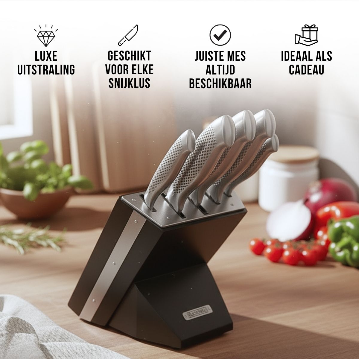 - Complete 6-piece set: chef's knife, bread knife, santoku knife, office knife, paring knife, and wooden knife block