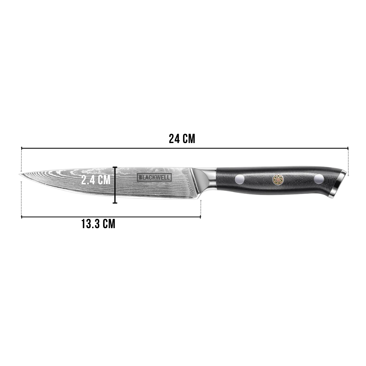 It Blackwell office knive Damascus of 12.5 cm is the perfect addition to any kitchen, whether you are a professional chef or an avid home cook. This knife is made of high-quality damask steel, known for its unmatched sharpness and durability. With a 12.5cm blade, this knife is ideal for precise cutting tasks such as fine chopping vegetables, fruits, and herbs.