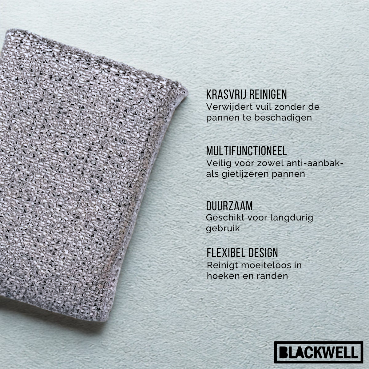 The pan sponge from Blackwell is a multifunctional sponge for cleaning all kinds of things. The pan sponge can be used to clean the countertop and induction cooktop, but it is also perfect for cleaning stainless steel pans or non-stick pans. This pan sponge is silver in color.