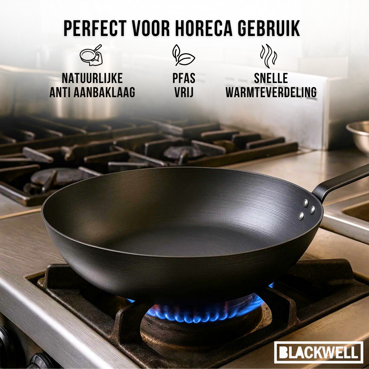 Experience traditional wok cooking with the Blackwell wok of 30 cm, made from sturdy carbon steel. This wok has no artificial non-stick coating but develops a natural patina through seasoning and use, providing an authentic non-stick effect. Ideal for high temperatures, allowing you to quickly sear and keep your ingredients crispy. Perfect for stir-fries, Asian classics, or quick one-pan meals.