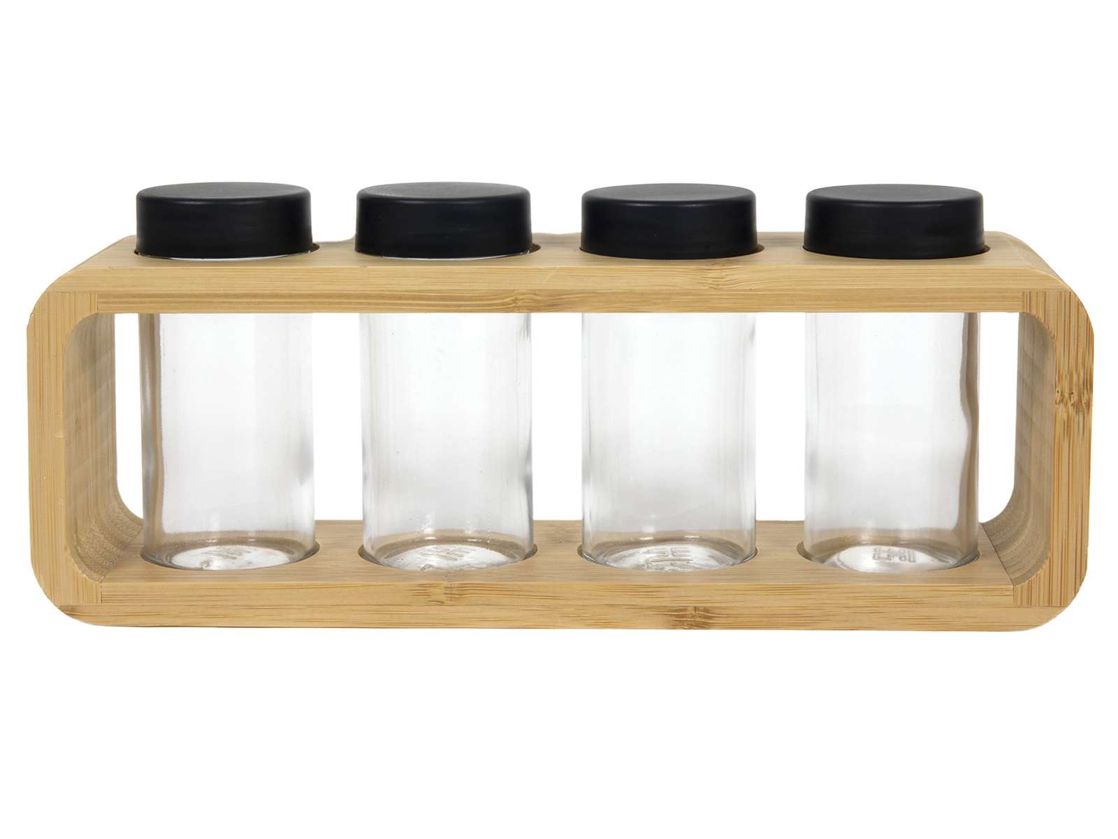 Bring natural elegance to your kitchen with this 4-piece bamboo spice rack. The rack includes four transparent jars with memorable lids and offers a stylish yet practical way to keep your favorite spices within reach while cooking.