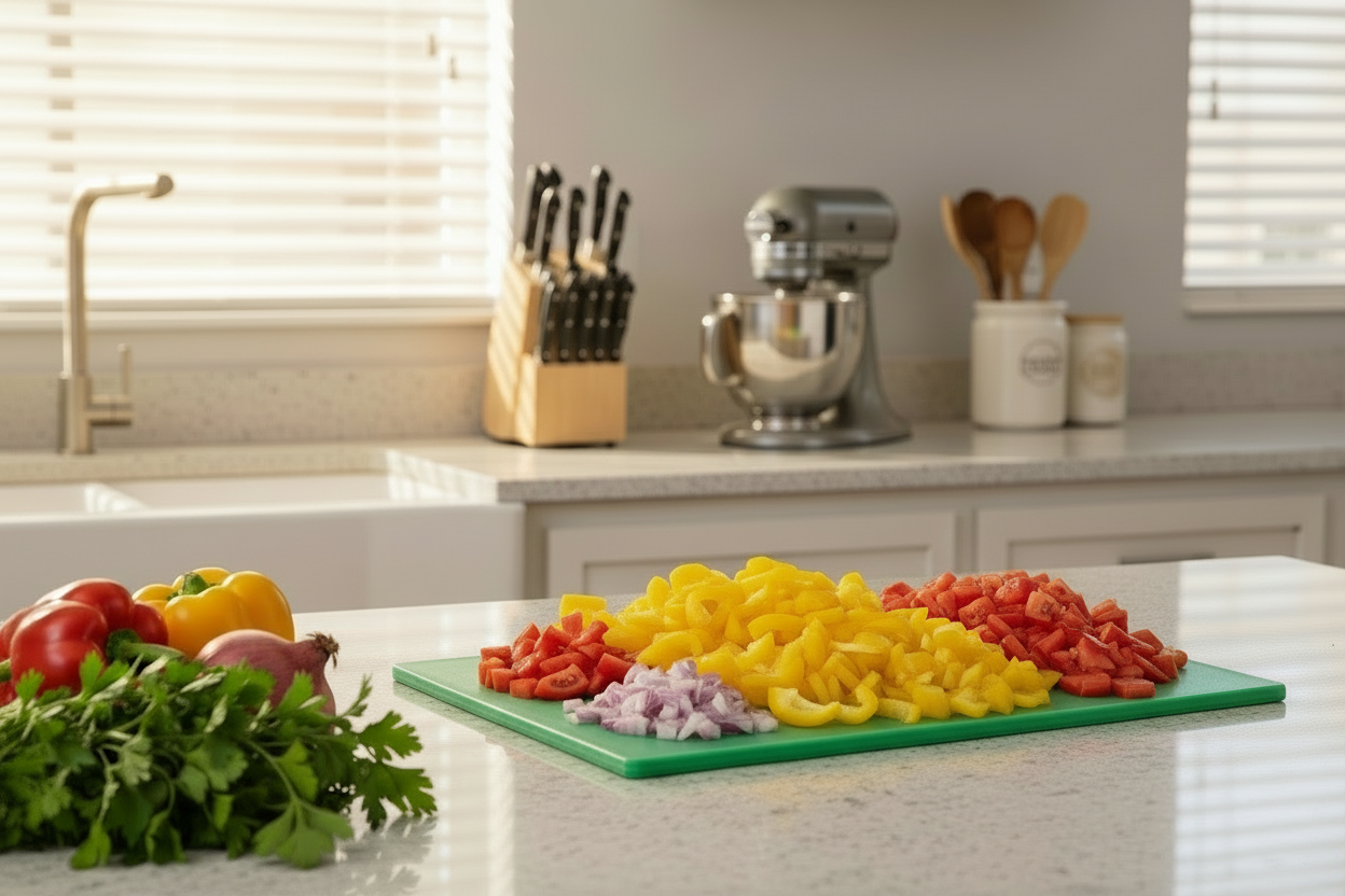 In a domestic kitchen, color coding is less strict, and you can safely use the green cutting board for a variety of products, as long as you clean it thoroughly. The sturdy plastic is cut-resistant, durable, and easy to clean with a short cycle in the dishwasher. The board sits securely on your countertop, allowing you to work safely and with control, whether you're chopping onions or preparing fruit.