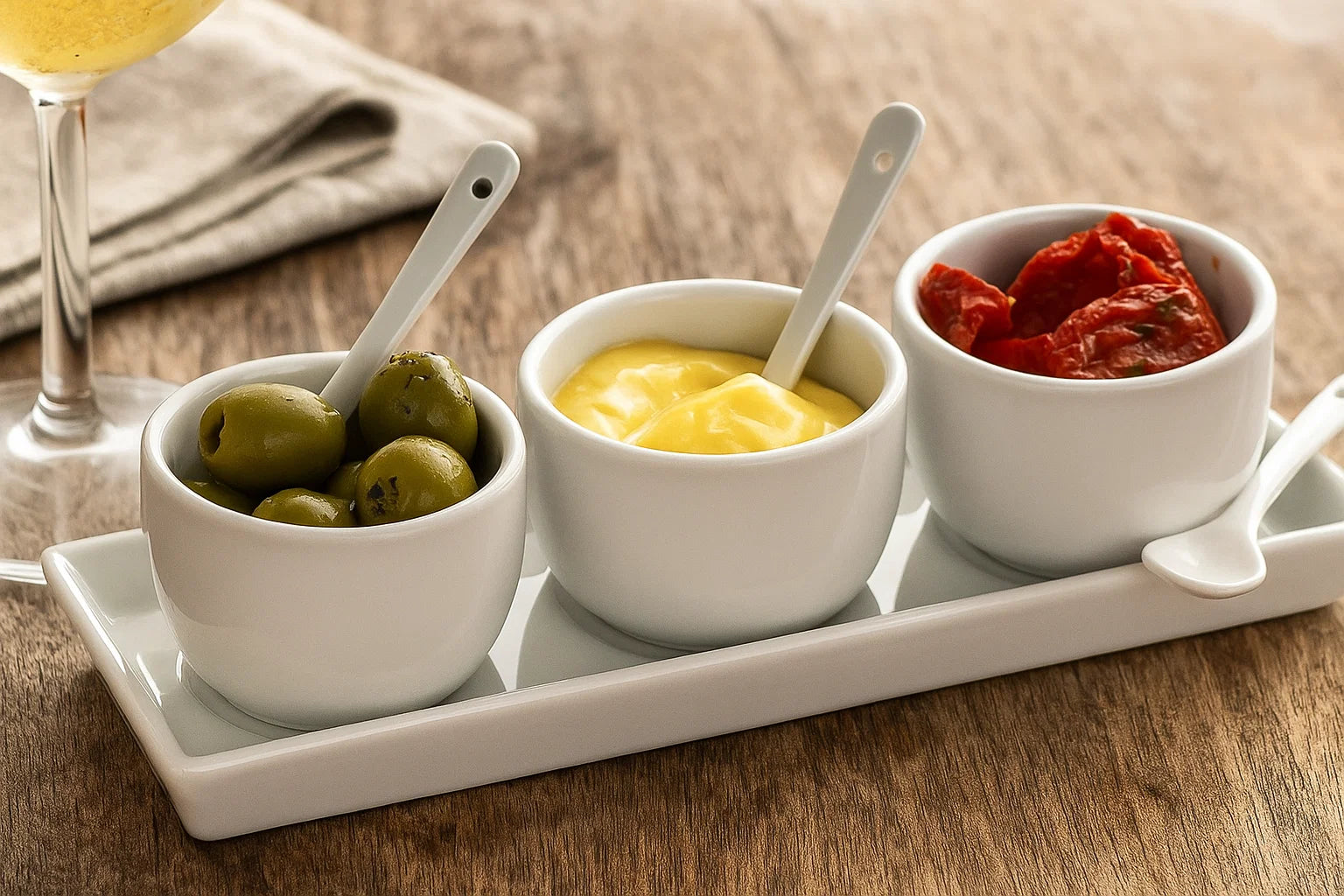 Complete your table with this stylish 7-piece set of porcelain dipping bowls. Perfect for sauces, dips, olives, or small flavor enhancers that complement your dishes. The fine porcelain provides an elegant appearance and showcases each ingredient beautifully.