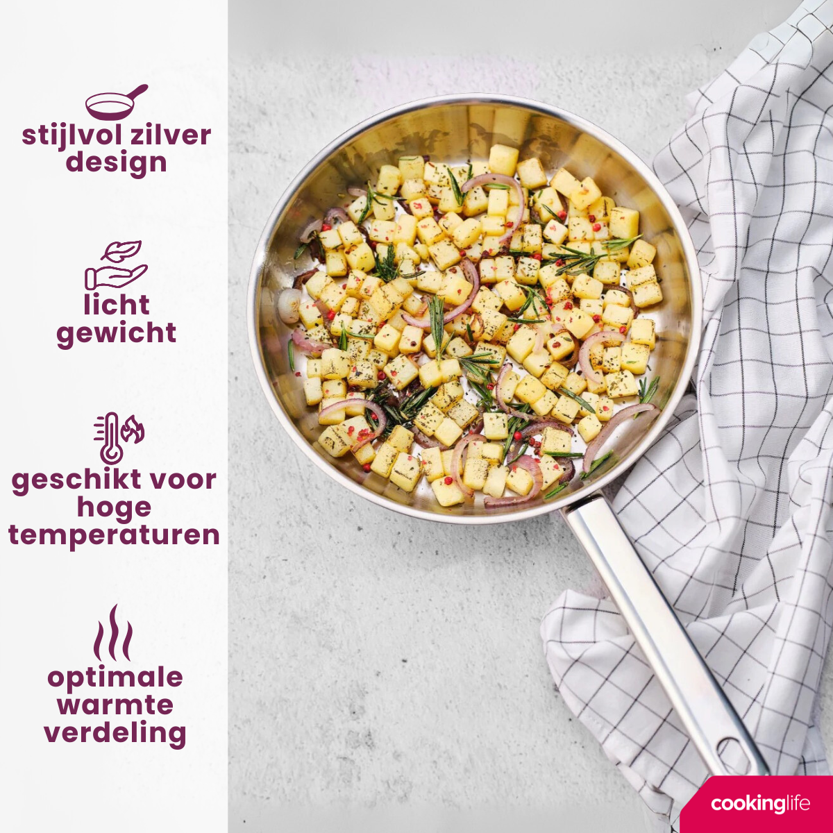 Discover the Superior frying pan of 24 cm from Cookinglife: a frying pan that elevates your daily cooking skills. Thanks to the PFAS-free coating, you can cook with less fat, while the pan is robust enough for dishes that require a bit more heat—think steak, fish, or vegetables. The spacious size is perfect for single or double portions and provides enough room to cook comfortably without ingredients spilling over the edges.