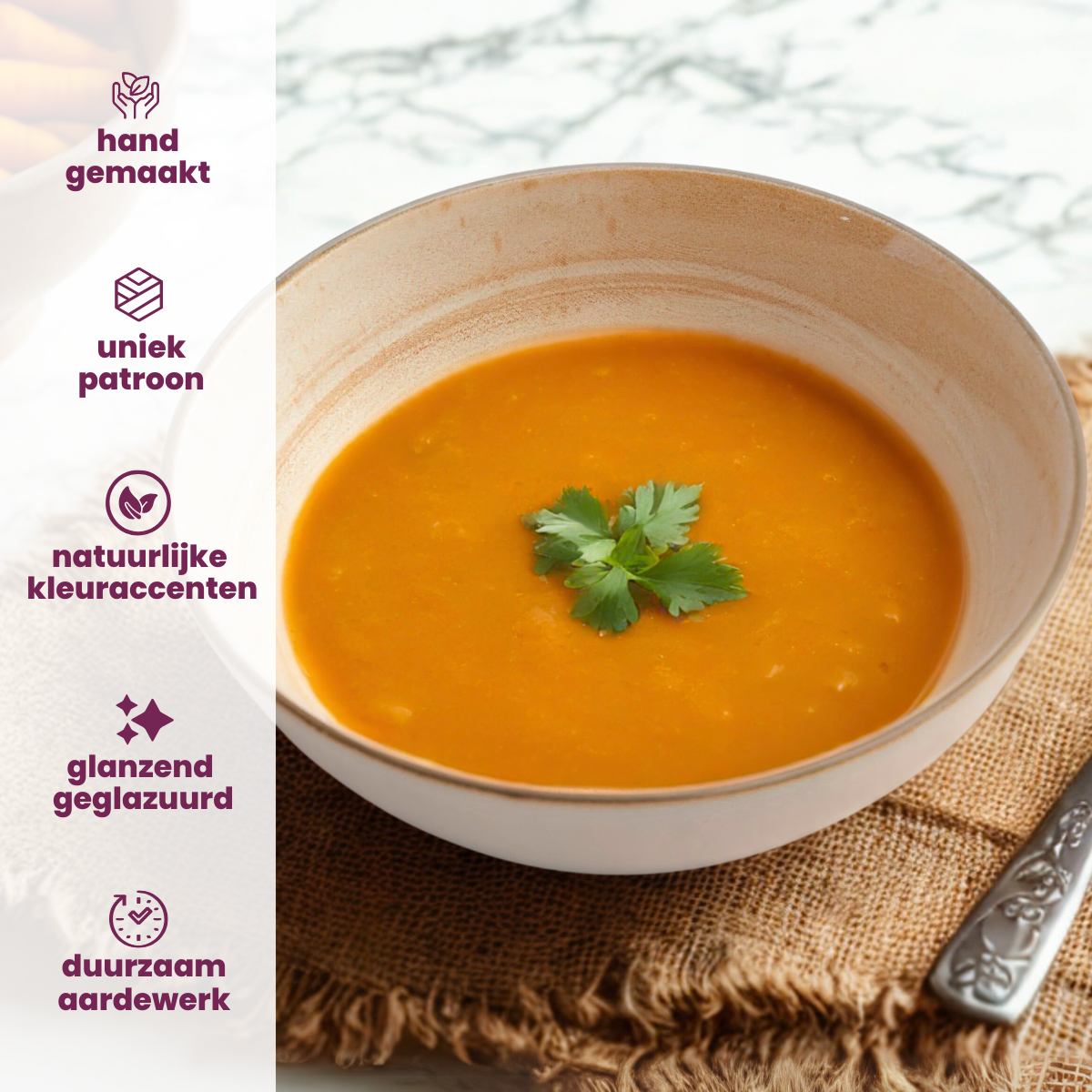 The deep plates from the Sintra collection by Cosy & Trendy have a diameter of 21 cm and are ideal for serving pasta dishes, soups, salads, or other dishes with a rich sauce. The subtle blue glaze, combined with a spiral pattern and dark rim, gives the plate a stylish and calming appearance on the table. Due to the reactive glaze, each plate is unique.