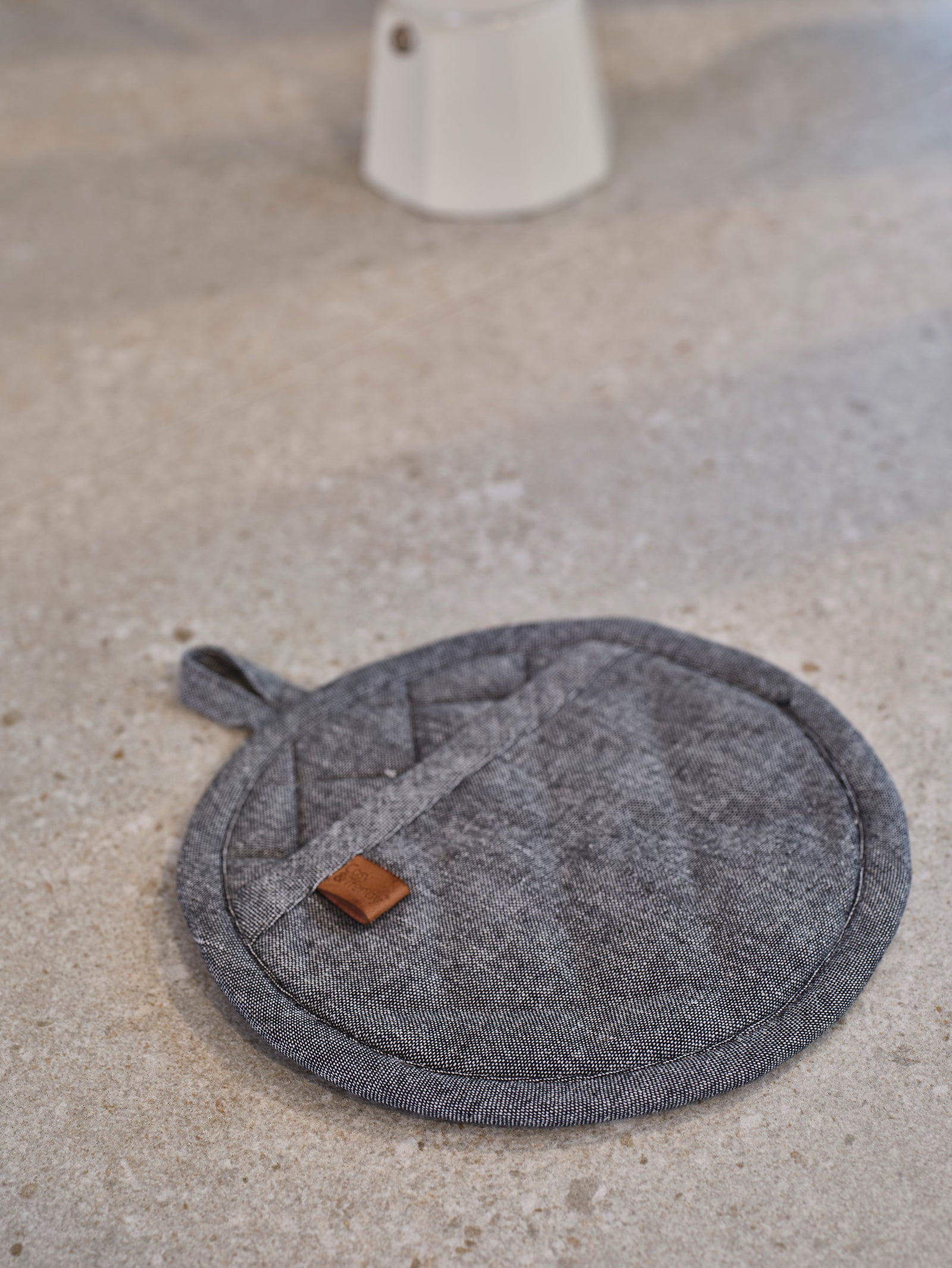 For a sleek, timeless look, choose this round pot holder from Cosy Trendy in Black Chambray. The insulating polyester filling and tightly woven cotton protect your hands from heat up to approximately 200 °C. The practical hanging loop ensures it is always within reach and keeps your kitchen organized.