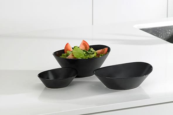 This salad bowl measuring 20 by 18 cm is made of black pottery. It is a real eye-catcher on the table. The strong material ensures that it is both microwave and dishwasher safe. Despite the organic mould stack the bowl stacks easily, making it easy to use.