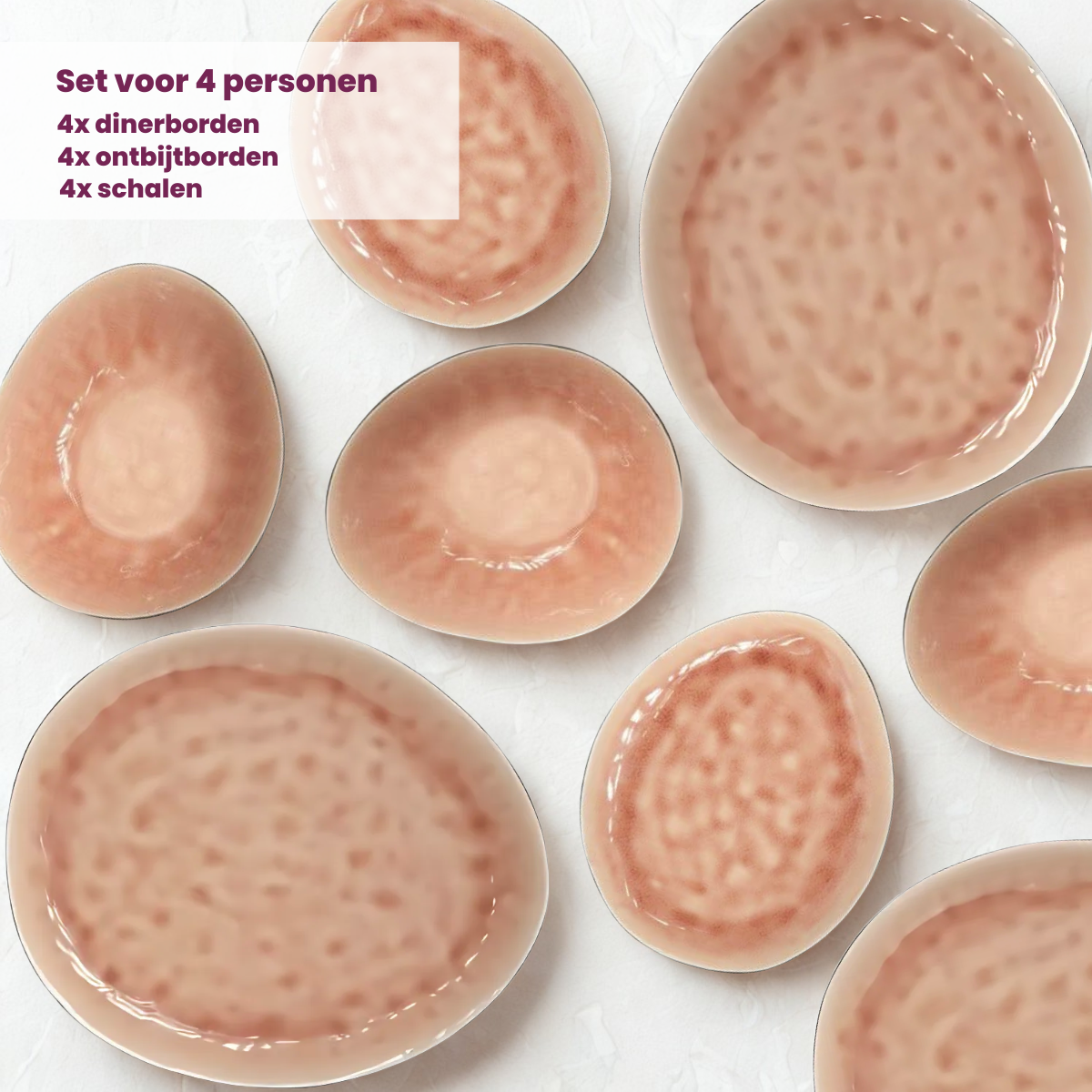This 12-piece dinnerware set from the Laguna Old Rose series offers everything you need for a refined and elegant table setting. The set includes dinner plates, side plates, and bowls, all in a soft rose hue that gives your table a warm, inviting appearance. The timeless design makes the set suitable for both everyday use and special occasions.