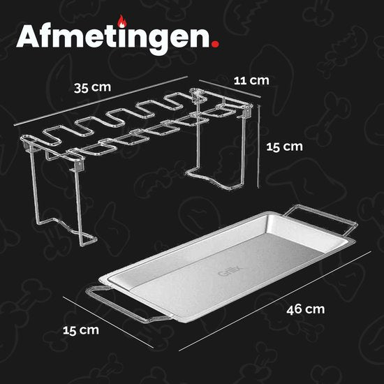 With the GrillX chicken wing holder, you no longer have to worry about flipping the chicken! Thanks to this handy chicken holder, the legs cook evenly and you prevent the chicken from sticking to the barbecue. Moreover, a convenient tray ensures that drips do not fall onto the coals, and you can prepare vegetables in the same tray at the same time. A delicious meal guaranteed!