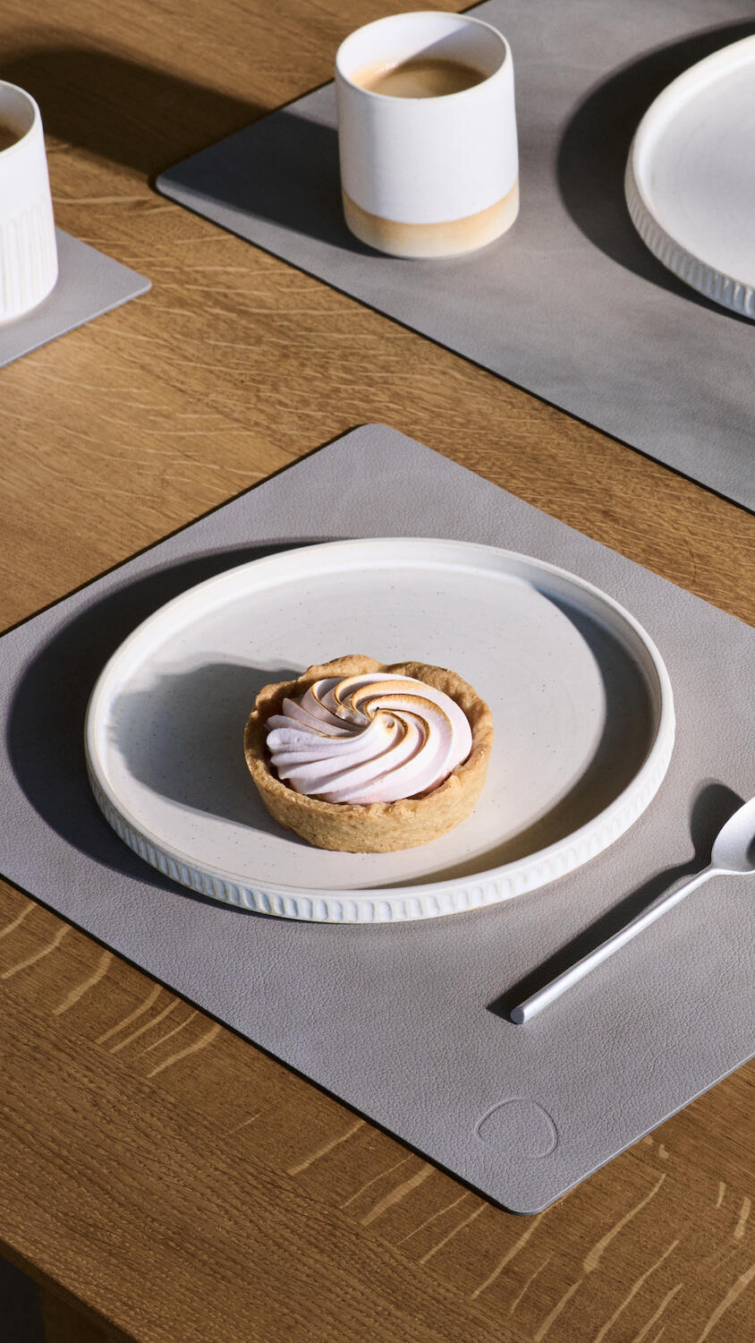 The LIND DNA Placemats Nupo – Light Grey – 45 x 35 cm – 2 Pieces give your dining table a calm, modern look. Made from real leather, 80% recycled leather, and 20% natural rubber. These placemats feature a beautiful leather surface and a soft, supple texture. The subtle light grey color adds a timeless accent and protects your table from scratches, heat, and stains.