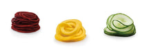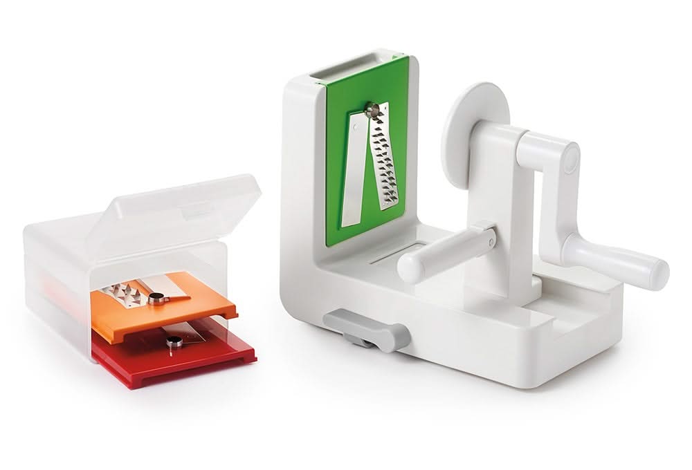This spiralizer from OXO Good Grips is perfect for making vegetarian noodles, a delicious and healthy alternative to pasta. You can also use the spiralizer to make even spirals for curly fries, salads, garnishes and more. Three interchangeable stainless steel cutting blades make spaghetti shapes (1/8 inch), fettuccine shapes (1/4 inch) or wide spirals. The suction cup holds the spiralizer firmly in place while cutting. The box with the cutting blades keeps the various cutting blades clean, safe and organized together, and stores compactly inside the spiralizer after use. Therefore, the spiralizer does not take up much space, while being a lot larger and more robust than the hand spiralizer.