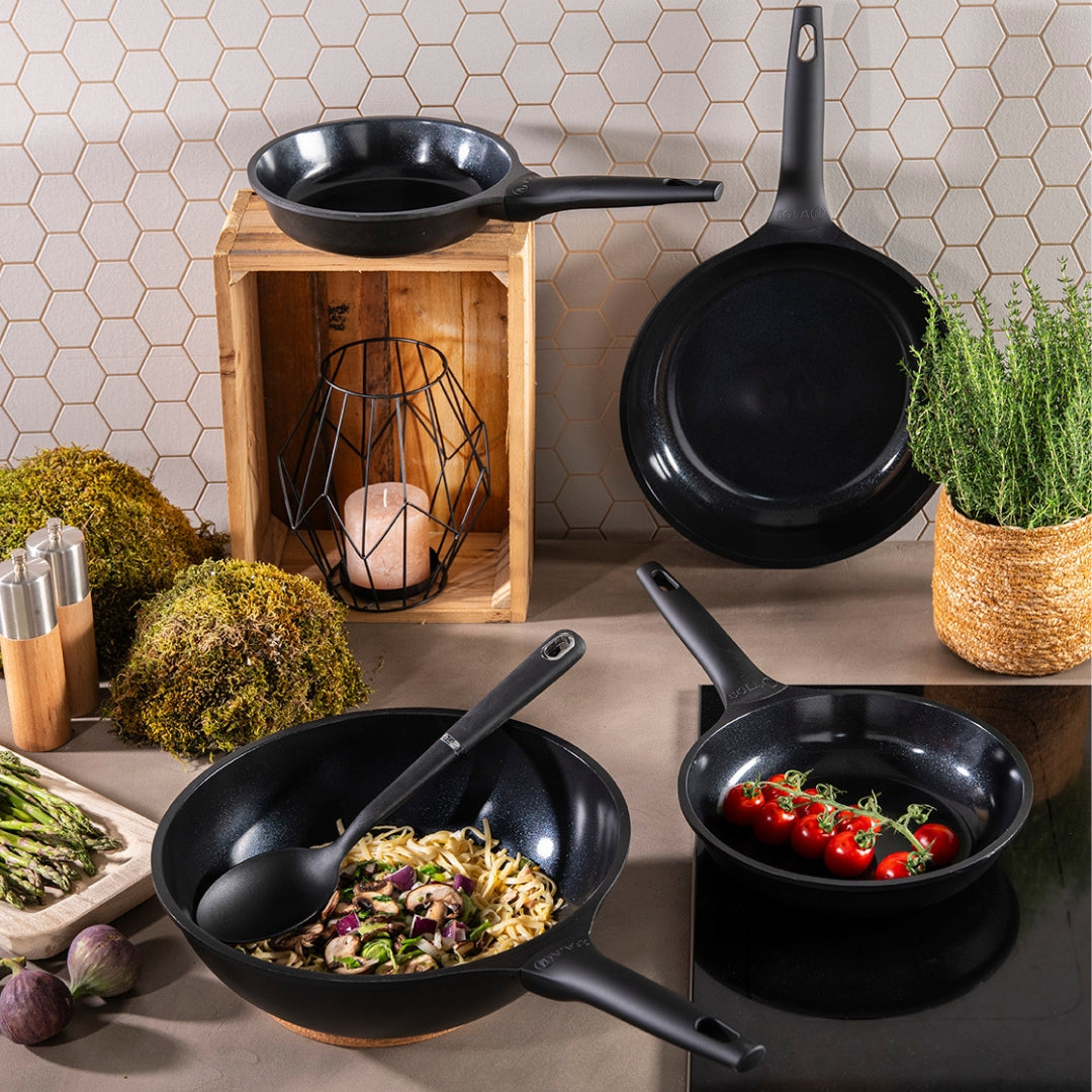 The Sola Ceramic Deluxe frying pan set offers a perfect combination of ease of use and healthy cooking performance. This set contains two pans in the most commonly used sizes – Ø 24 cm and Ø 28 cm – with which you can effortlessly prepare both small and large dishes. The ceramic non-stick coating is PFAS-free, which ensures low-fat and safe cooking.