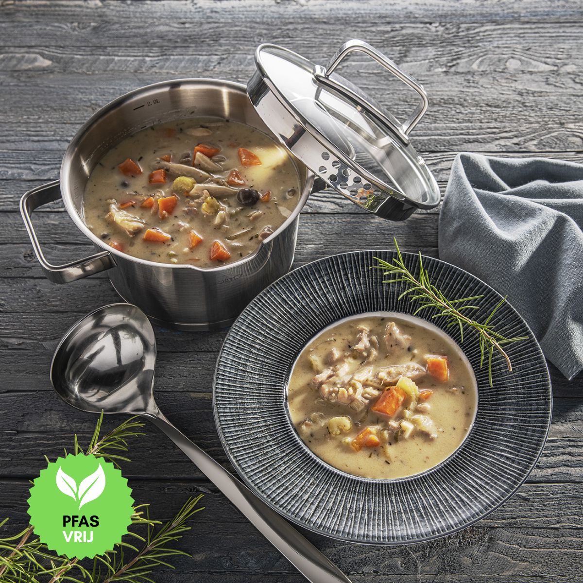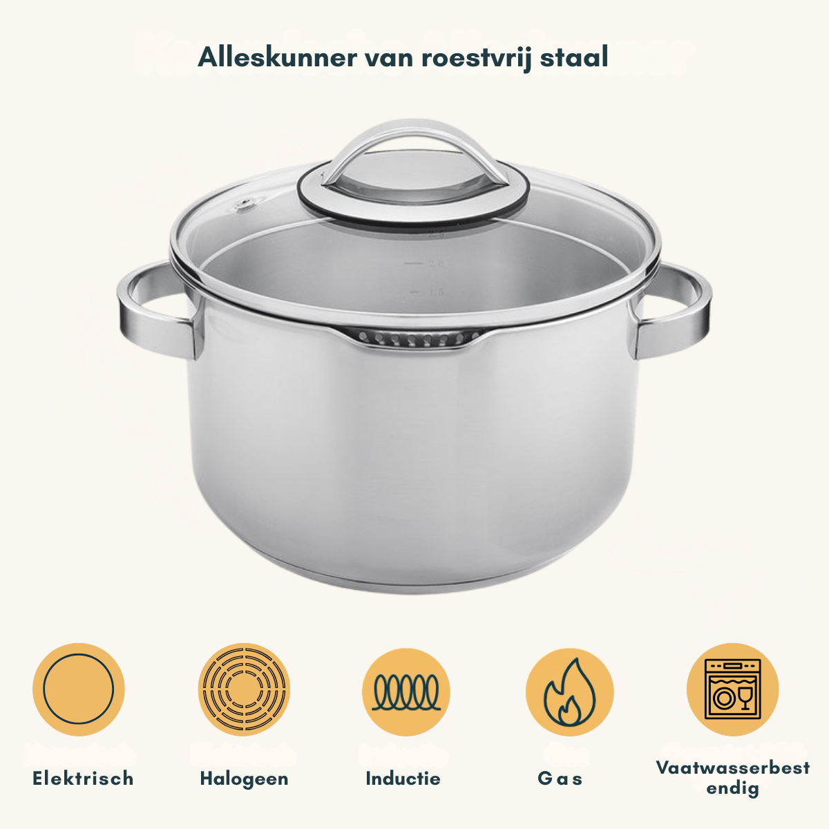 Deze pannenset combineert functionaliteit met een modern design. Dankzij het geïntegreerde afgietsysteem kun je eenvoudig en morsvrij water afgieten, terwijl de maataanduiding aan de binnenkant van de pannen zorgt voor nauwkeurig koken zonder extra hulpmiddelen. Perfect voor hobbykoks en culinaire liefhebbers die efficiëntie en stijl waarderen.