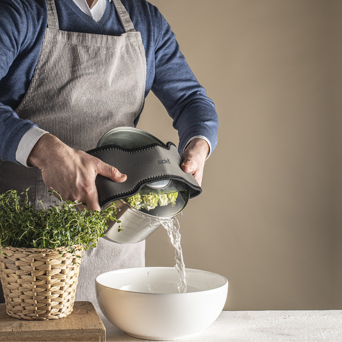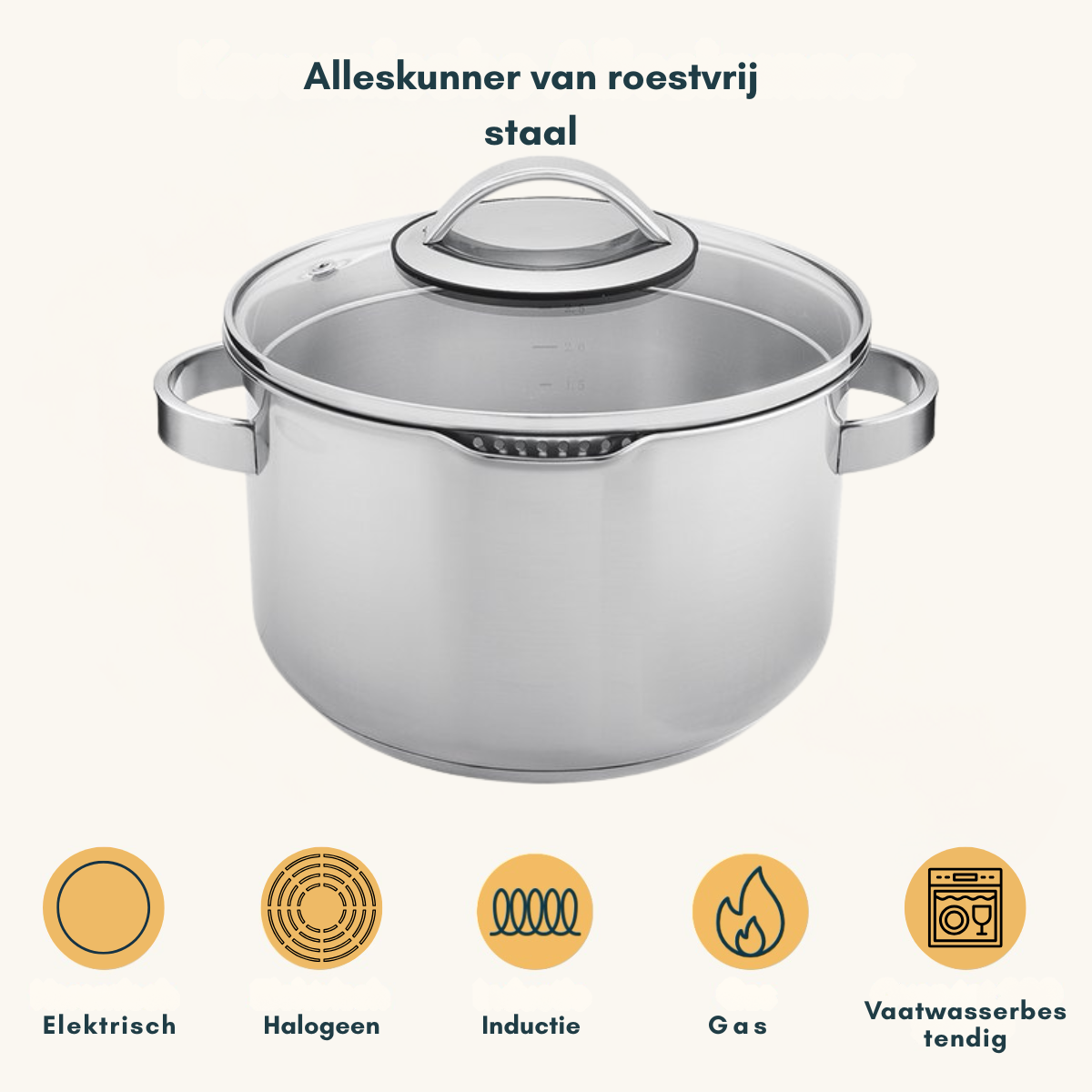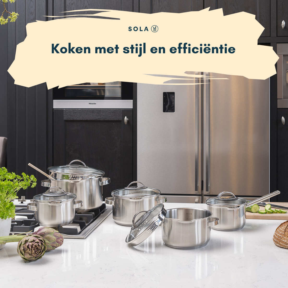 The timeless design of the pans and the shiny stainless steel give a modern look to your kitchen. The pans feature sturdy handles and tight-fitting glass lids, allowing you to closely monitor the cooking process. The Sola Cookware set Pearl is suitable for all heat sources, including induction, gas, ceramic, halogen and electric.