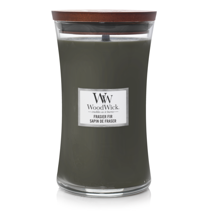 Description WoodWick Scented Candle Large Frasier Fir - 18 cm / ø 10 cm - Scented Candle in Glass - Wooden Wick
